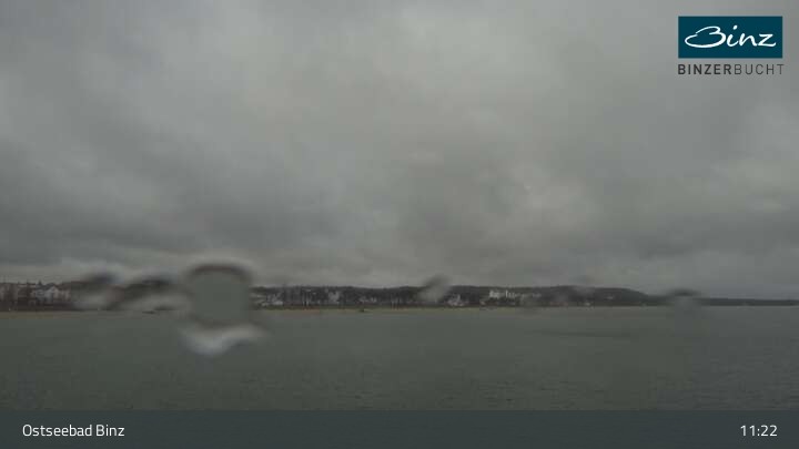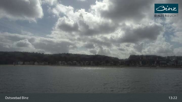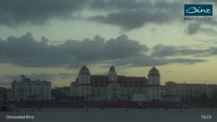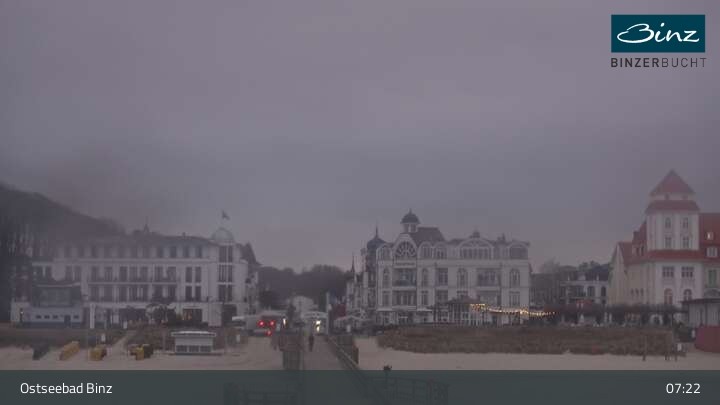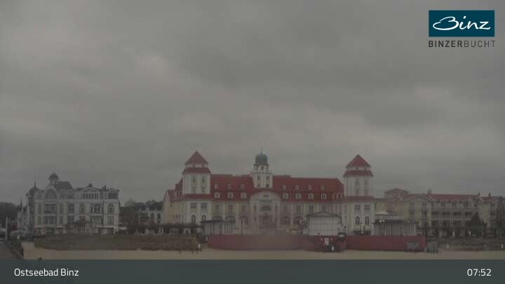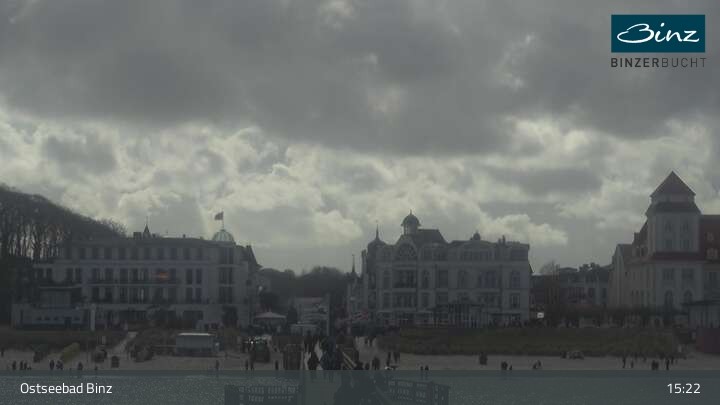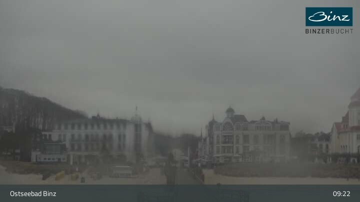 Zu sehen ist die Strandpromenade des Ostseebades Binz. Die Webcam ist auf der Seebrücke Binz positioniert und zeigt unter anderem Kurhaus, Strandpromenade und den Fischerstrand.