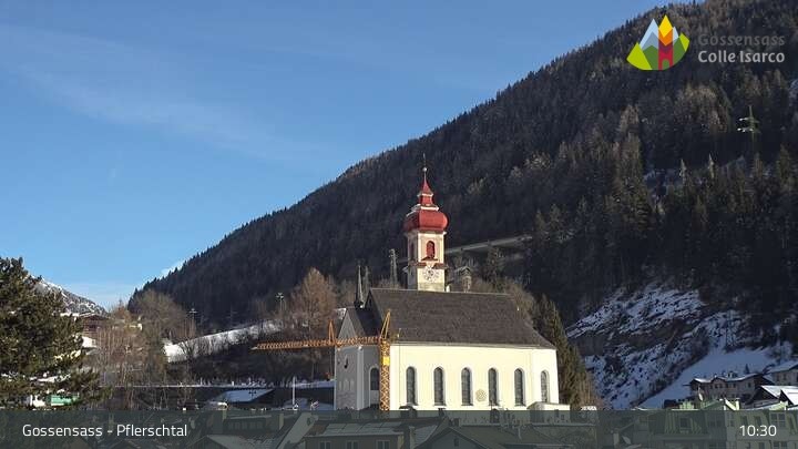 Die Kamera zeigt die Kirche Parrocchia San Valentino in Gossensass im Eisacktal.