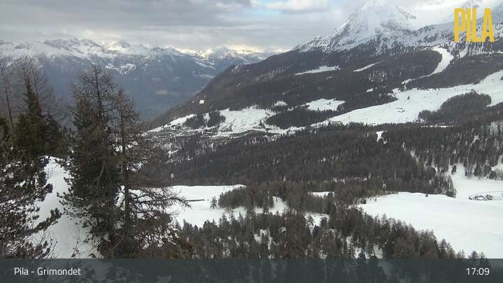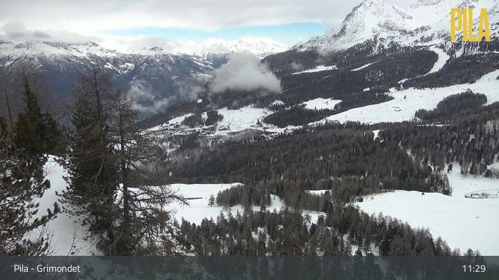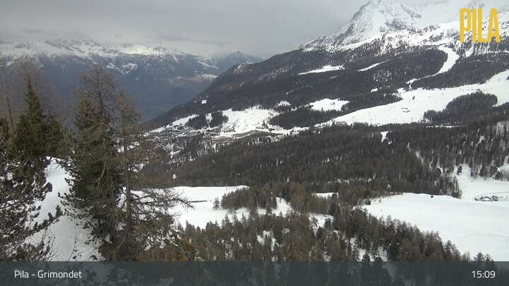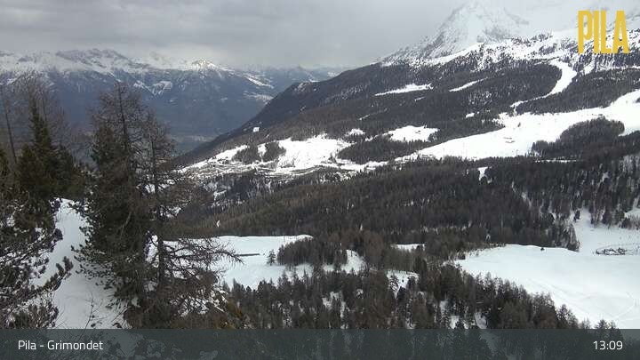 Diese Webcam an der Bergstation des Sessellifts Grimondet blickt auf die umliegende Bergwelt von Pila im Aostatal.