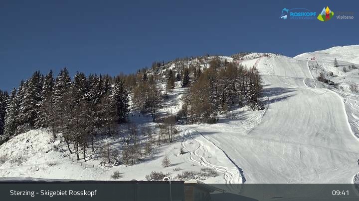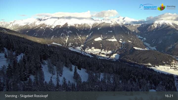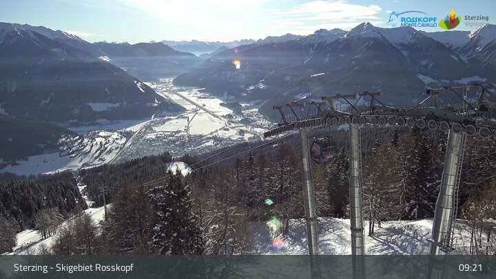 Die Kamera steht an der Bergstation der Seilbahn am Rosskopf und zeigt die Stubaier Alpen.