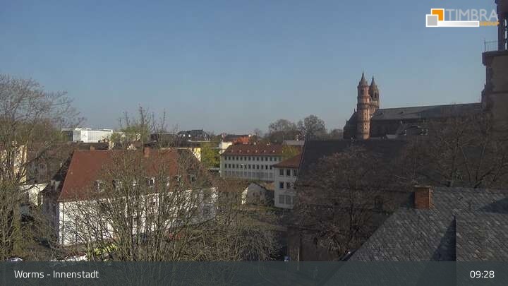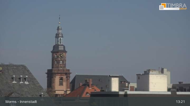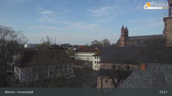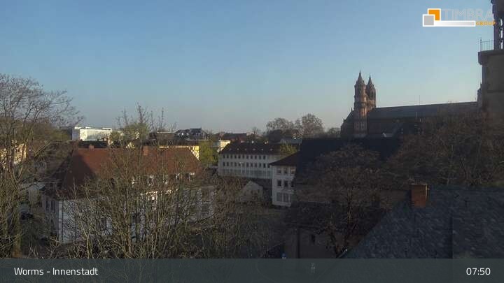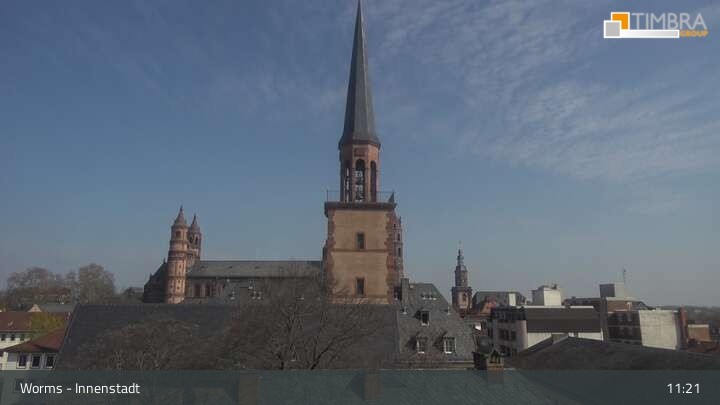 Die Webcam befindet sich in der Wormser Innenstadt. Der Blick wandert von der Magnuskirche, hinter welcher die Türme des Wormser Doms St. Peter zu sehen ist über die Dächer der Stadt bis zum Andreasstift und der Stadtmauer.